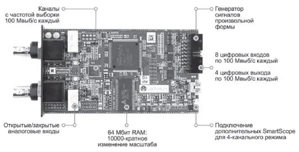 SmartScope выполняет функции осциллографа, логического анализатора и генератора сигналов, поставляется в алюминиевом корпусе размерами 110x64x24,2 мм и весит 158 г. Средства программной поддержки, обеспечивающие пользовательский интерфейс и функциональность устройства, могут быть загружены с сайта SmartScope. В настоящее время они доступны для Android (на Google Play Store или на сайте LabNation), Apple Mac OS X, Apple iOS (Jailbroken), Microsoft Windows 7, 8 и 10, а также для Linux-дистрибутивов Ubuntu и Два аналоговых канала со скоростью до 100 млн. выборок в секунду обеспечивают полосу пропускания 30 МГц по уровню -3 дБ. Входной импеданс равен 1 МОм/1 пФ, а максимальный уровень входного сигнала - 35 В. При 8-битной точности разрешение осциллографа составляет 2,5 мВ. ПО прибора предоставляет пользователю несколько экранных функций для выбора масштабов по горизонтали и вертикали, растяжки развертки, подключения входов, управления синхронизацией и для простых измерений напряжения.