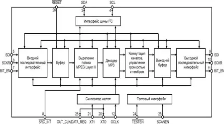 Интерфейс I2C служит для управления режимами работы микросхемы посредством внешнего микроконтроллера, а также для получения информации о текущем состоянии модулей микросхемы. Все регулировочные параметры микросхемы записаны во внутренние регистры и доступны для записи по шине I2C.Вычислительное ядро микросхемы представляет собой высокопроизводительный цифровой сигнальный процессор (DSP), обеспечивающий декодирование звукового потока формата MP3, цифровую фильтрацию сигнала, а также управление модулем синхронизации микросхемы.