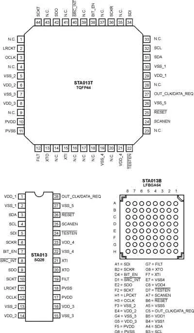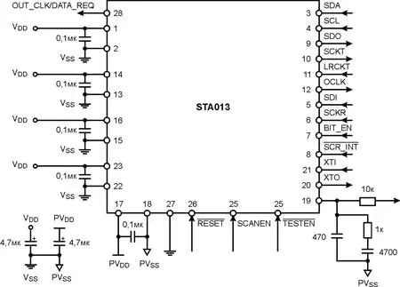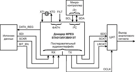 Микросхема STA013 представляет собой полностью интегрированный универсальный декодер потоков MPEG Layer III Audio спецификаций MPEG 1, MPEG 2 и MPEG 2.5. Приведем основные функции микросхемы:Полная поддержка следующих форматов сжатого звукового сигнала: