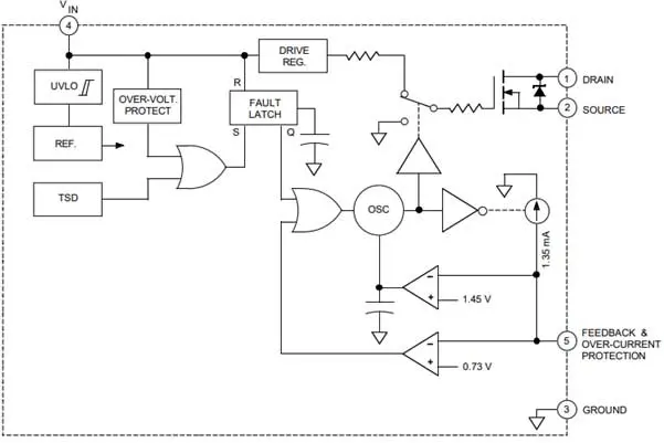 Это устройство включает в себя основную схему управления и возбуждения с мощным дискретным МОП-транзистором (с лавинным номиналом).