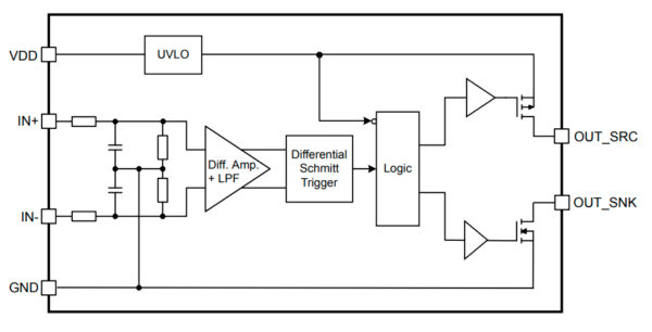 Благодаря реально-дифференциальному входу и раздельным выходам для заряда и разряда затвора силового транзистора возможны различные варианты реализации управления: