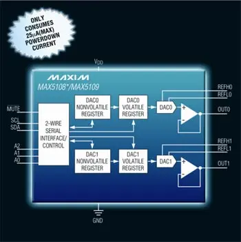 MAX5108/MAX5109 и MAX5115/MAX5116 функционирует при питающем напряжении от +2,7В до +5,5В и величиной тока питания в 200мкА/ЦАП во время операции записи. Для сравнения, ближайшие по характеристикам энергонезависимые ЦАП работают с питающим током в 3мА. Программируемая функция выключения снижает питающий ток до 20мкА., в сравнении с уровнем 1 мА в конкурирующем устройстве. MAX5108/MAX5109 и MAX5115/MAX5116 включаются последней командой, хранящейся в энергонезависимой памяти (перед выключением) и передаваемой в регистры ЦАП, что устанавливает заданные уровни на выходах ЦАП. Команда обнуления переводит значения на выходе каждого ЦАП на соответствующий нижний уровень опорного напряжения. Возможность адресации данных позволяет подсоединять каждое из устройств к одной и той же шине I(2)С.