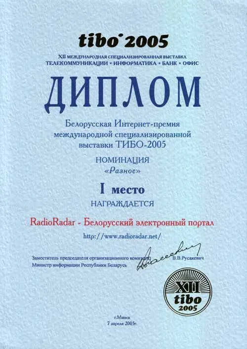 В этом году наконец-то наш сайт оценили по достоинству. Сайт награжден Интернет-премией международной специализированной выставки TIBO'2005 и получил первое место в номинации "Разное".