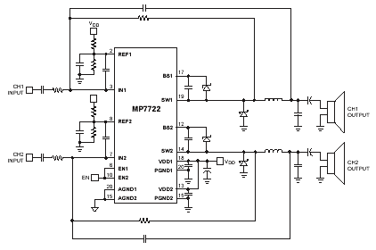 MP7722DF – уникальный стерео усилитель низкой частоты класса D с выходной мощностью 20Вт на канал при сопротивлении нагрузки 4Ом. Это двухканальный вариант усилителя MP7720 из серии полностью интегральных усилителей мощности второго поколения от MPS с беспрецедентно малыми габаритами, благодаря размещению в одном кристалле: - 180мОм силовых MOSFET-транзисторов; - системы устранения акустических щелчков включения/выключения; - цепей защиты от короткого замыкания; - системы выбора режимов Mute и Standby. Аудио усилители класса D компании MPS обеспечивают высокое качество звучания класса A/B при КПД более 90%. Схема базируется на патентованной MPS технологии изменяемой частоты, которая снижает искажения, уменьшает время отклика и позволяет работать при однополярном питании.