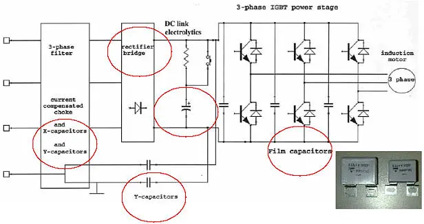 На рис снизу красным цветом обведены компоненты (диодный мост, электролитические и супрессорные конденсаторы, а также снабберные конденсаторы серии MMKP386, включенные паралельно транзисторным полумостам), которые может предложить использовать Vishay собственного производства в схеме управления трехфазным электродвигателем.