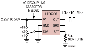 LTC6906CS6 – компактный и простой в применении прецизионный программируемый генератор. На частоте 100кГц LTC6906 потребляет всего 12мкА от источника 3,3В. Генерируемая частота программируется единственным резистором в диапазоне 10:1 с первоначальной точностью лучше 0,5%. Выходная частота может быть поделена на 1, 3 и 10 для расширения общего частотного диапазона до 100:1, то есть от 10кГц до 1МГц. Рассчитать выходную частоту LTC6906 можно с помощью простейшей формулы: