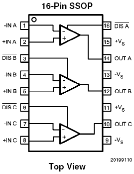 LMH6733 предлагается в корпусе SSOP-16 в проходной конфигурации выводов. Каждый из усилителей имеет индивидуальный вывод shutdown.