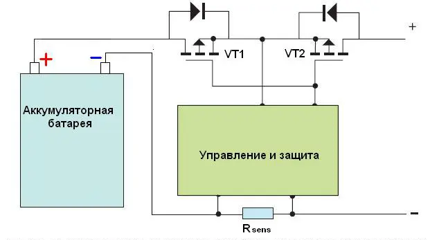 Одной из основных схем, в которых с успехом могут применяться P-канальные транзисторы, является схема коммутации и защиты аккумуляторной батареи, представленная на рисунке: