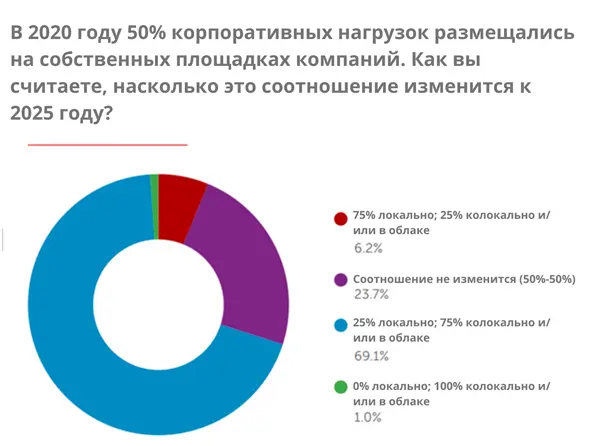 Большинство опрошенных респондентов (69%) считают, что доля корпоративных нагрузок, размещаемых в облака и коммерческие ЦОД, увеличится с 50% до 75%. Большинство остальных (24%) полагают, что нынешнее соотношение 50:50 сохранится. Лишь незначительное меньшинство думает, что либо все переместится за пределы предприятий, либо локальные площадки восстановят свои позиции. Эти результаты указывают на растущую зависимость ИТ-инфраструктуры от гибридных ИТ, где для разных рабочих нагрузок используются разные варианты развертывания.