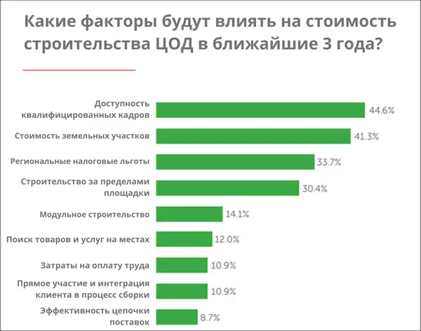 Ключевыми факторами воздействия с точки зрения затрат на строительство центра обработки данных в течение следующих трех лет считаются наличие профессиональных навыков (45%), стоимость земли (41%), региональные налоговые льготы (34%) и использование строительства за пределами площадки (30%). В то время как наличие навыков возглавляет список, затраты на рабочую силу играют гораздо меньшую роль. Это говорит о высокой стоимости поиска и удержания нужных кадров.