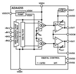 ADA4255 представляет собой прецизионный инструментальный усилитель с программируемым коэффициентом усиления (PGIA). Особенностью усилителя ADA4255 является наличие встроенного генератора подкачки биполярного заряда. Благодаря встроенному генератору подкачки заряда ADA4255 создает высоковольтный биполярный источник питания, необходимый для достижения широкого диапазона входного напряжения (38 В, для VDDCP = 5 В) без снижения входного импеданса. Топология подкачки заряда ADA4255 позволяет реализовать изолированные каналы только с помощью низковольтных компонентов, что снижает сложность, размер и время разработки, что особенно важно в промышленных системах.