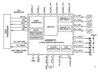 ADIN2111 включает в себя коммутатор, два ядра физического уровня Ethernet (PHY) с интерфейсом управления доступом к среде (MAC) и всеми необходимыми аналоговыми схемами, а также буферизацией тактовых импульсов ввода и вывода.