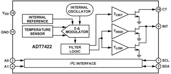ADT7422 представляет собой высокоточный цифровой датчик температуры, разработанный с учетом требований стандартов ASTM E1112 при монтаже на печатную плату и управляемый по шине данных I2C.