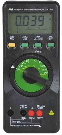 В режиме "Мегомметр" АКИП-8608 обеспечивает измерение сопротивления изоляции Rиз до 3,1 ГОм (макс. разрешение 1 кОм) с выбором постоянного испытательного напряжения из ряда фиксированных значений: 50 В, 100 В, 250 В, 500 В, 1000 В.