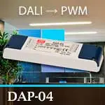 Преобразователь DAP-04 от Mean Well позволяет подключиться к шине управления освещения по интерфейсу DALI и на выходе получить 4 независимых аналоговых ШИМ (PWM) сигнала. Благодаря DAP-04, вместо готовых светильников или драйверов с управлением по DALI можно применить дешевые светильники или драйверы с простым управлением по сигналу ШИМ или 0-10 В. Таким образом реализуется простая управляемая система освещения на основе DALI с небольшими финансовыми затратами.