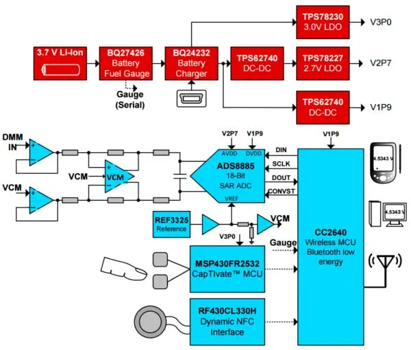 Основной функционал устройства реализован на беспроводном микроконтроллере CC2640, высокую точность измерения обеспечивает 18-разрядный SAR ADC ADS8885 в паре с прецизионным источником опорного напряжения REF3325. Мультиметр имеет шкалу 4½ разряда, при этом он вычисляет истинные среднеквадратичные значения (TrueRMS) c точностью до 0,05%.