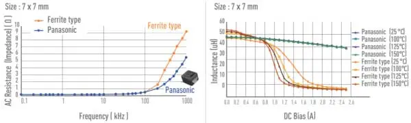 Дроссели семейства ETQP – это мощные силовые индуктивности, разработанные компанией Panasonic для применения в понижающих и повышающих DC/DC-преобразователях с высоким выходным током. Главной особенностью дросселей ETQP является использование в качестве сердечника материала на основе металлического композита, который в отличие от стандартного феррита позволяет получать сверхвысокие токи насыщения в малых габаритах. Еще одним преимуществом металлического композита по сравнению с ферритом является уменьшение потерь на более высоких рабочих частотах, что положительно влияет на общий КПД проектируемого DC/DC-преобразователя. Эффективная индуктивность дросселей семейства ETQP падает менее сильно с ростом рабочего тока в отличие от стандартных ферритовых катушек (эффект насыщения).