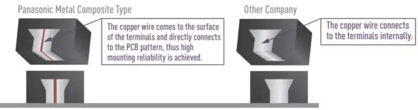 Дроссели ETQP относятся к классу высоконадежных катушек, они имеют сертификат соответствия AEQ-Q200, устойчивы к механическим деформациям и вибрациям вплоть до 30g и способны работать при высоких рабочих температурах до 160°C (для дросселей серии ETQP8M***J**). Дополнительную надежность дает особая конструкция выводов: концы внутренней обмотки прокладываются вдоль внешних выводов дросселя и вместе с ними напрямую распаиваются на посадочную площадку печатной платы, что минимизирует эффект отрыва в процессе пайки и эксплуатации.