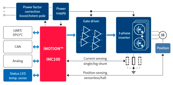 Компания Infineon выпустила серию универсальных цифровых контроллеров IMC100 для управления бесколлекторными двигателями. Данное решение является уже проверенным на практике и позволяет значительно сократить время вывода на рынок новых продуктов, а также снизить затраты на разработку. Платформа Motor Control Engine 2.0 позволяет унифицировать систему управления двигателями и для разных задач и применений, просто, меняя силовую часть системы (транзисторы + драйверы).