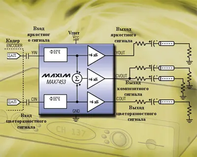 Для достижения высокого качества изображения и для подавления нежелательных помех на выходе ЦАП во многих телевизионных приставках и DVD-проигрывателях требуется фильтр с идеальной характеристикой. Для соответствия этим требованиям, MAX7453 обладает максимально плоской АЧХ, ослаблением 42 дБ на частоте 27 МГц и коэффициентом усилением +6 дБ выходных видеоусилителей, способных работать на нагрузку 150 Ом по каждому каналу. Кроме того, выходные видеоусилители могут работать на нагрузку со связью по постоянному или переменному току. Напряжение гашения после согласующего резистора составляет менее 1 В. Это позволяет отказаться от использования дорогих, громоздких выходных конденсаторов в устройствах с выходом по постоянному току.