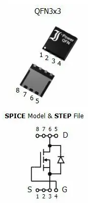 Компонент DI040N03PT-AQ поставляется в крошечном QFN3x3 "безвыводном" силовом корпусе, где почти все контактные группы "скрыты" на нижней стороне устройства. Таким образом, занимаемое на плате пространство составляет не более 3,3×3,3 мм². Низкое значение параметра RDS (on) (обычно 6 мОм), обеспечивает ток стока до 40 А при температуре корпуса 25 °C. Напряжение Сток-Исток может быть до 30 В, с энергией лавинного перехода для одиночного импульса 100 мДж. Эти MOSFET транзисторы подходят не только для работы в цепи постоянного тока, но и благодаря своим низким значениям включения и выключения также для высокочастотной коммутации.