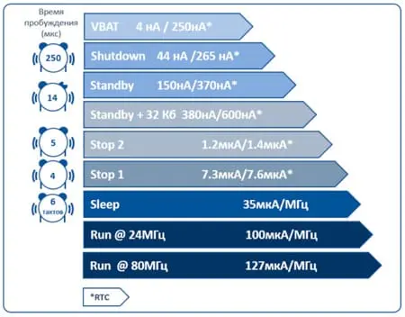 В STM32L412 также есть специальные таймеры, UART и компаратор, работающие даже при отключенном ядре. Микроконтроллеры семейства STM32L4 имеют семь режимов питания, позволяющих гибко настраивать потребление в зависимости от того, какая периферия и частота ядра необходимы в разные моменты времени его работы. В STM32CubeMX доступны бесплатные примеры проектов и комплексных библиотек.