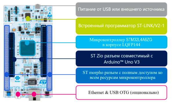 На плате NUCLEO-L4A6ZG размещено 3 пользовательских светодиода, 2 кнопки (USER и RESET), низкочастотный кварцевый генератор LSE: 32.768 KГц. Поддерживает взаимодействие с Arduino, ST Zio и morpho. Работа с отладочной платой не требует наличия отдельного специального программатора: все платы STM32 NUCLEO-144 включают в себя встроенные программаторы/отладчики ST-Link/ V2-1. Питание платы происходит от 5 В (разъем USB) или 3.3 В и 7…12 В через разъемы ST Zio или ST morpho, соответственно.