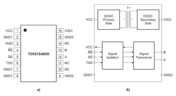 Рис. 1. Структура изолированного RS-485-трансивера TD551S485H: а) назначение выводов; б) блок-схема