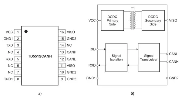 Рис. 2. Структура изолированных CAN-трансиверов TD551SCANH и TD551SCANHW: а) назначение выводов; б) блок-схема