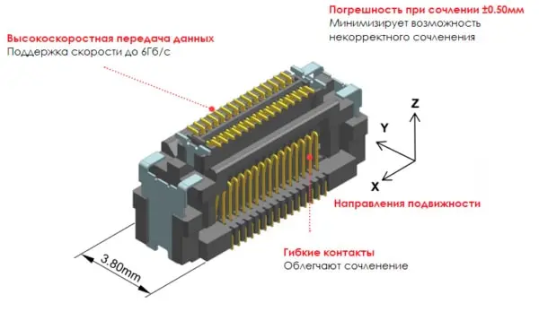Благодаря гибким контактам, разъемы серии SlimStack FSB5 допускают погрешность при сочленении ±0,50 мм по осям X, Y, Z. Это позволяет минимизировать возможность некорректного соединения.