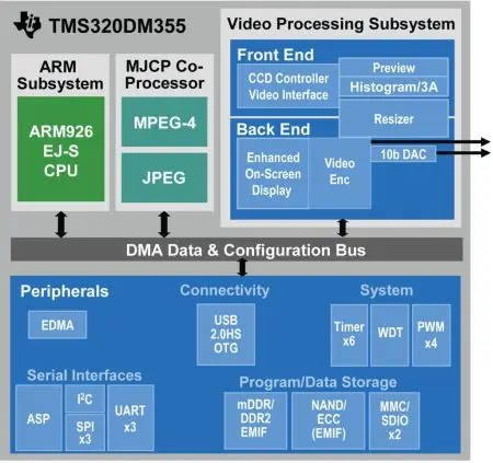 Процессор DM355 оборудован встроенным контроллером памяти (EMIF), который работает с DDR2 SDRAM или с недорогой памятью NAND. Кроме того, поддерживается пара интерфейсов SD/MMC, а также высокоскоростной USB 2.0 OTG (on-the-go).