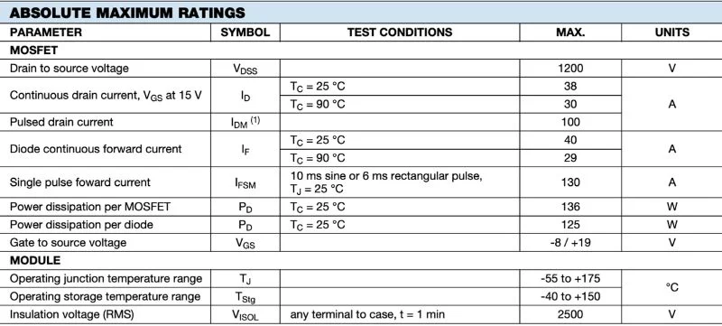 - Номинальное напряжение: 1200 В (VDSS)
