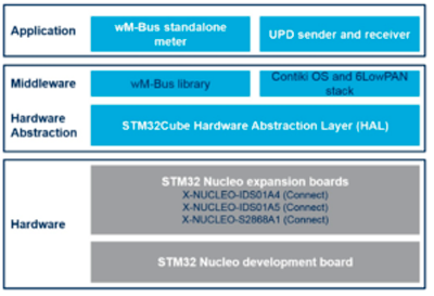 Программные примеры могут запускаться на плате STEVAL-FKI868V1-R установленной на микроконтроллерную плату NUCLEO-F401RE, NUCLEO-L053R8 или NUCLEO-L152RE (приобретаются отдельно). Разумеется пакет X-CUBE-SUBG1 можно использовать непосредственно с пользовательскими платами, т.к. все аппаратно зависимые определения вынесены в заголовочные файлы. Для доступа к периферийным узлам микроконтроллера используется STM32CubeHAL. Взаимодействие с ресурсами приемопередатчиков происходит через драйвера доступа к функциям SPIRIT1 и S2-LP аппаратно-независимым образом.