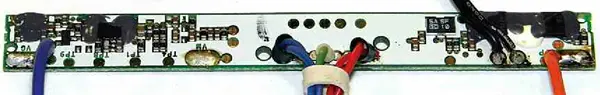 Перед тем как дать вторую жизнь литиевой аккумуляторной батарее нетбука, её склеенный пластмассовый корпус аккуратно вскрывают по шву. Если аккумуляторы окажутся разряженными "в ноль", их можно несколько минут подзарядить напрямую, минуя контроллер, током 0,5...1 А через токоограничивающий резистор или от источника тока. За это время аккумуляторы наберут напряжение, достаточное для включения контроллера. Измеренная ёмкость полностью заряженной батареи составила около 5400 мА·ч при разрядке током 1 А, что для батареи возрастом около десяти лет неплохой показатель. На плате контроллера (рис. 2) была маркировка BLA4AE00. Назначение проводов следующее. В центре два синих - минус контроллера, зелёный - управление, два красных - плюс контроллера. По краям платы: контакт VC (синий провод) - минус элементов G2 и G4, контакт Vp (красный провод) - плюс элементов Gl и G3, контакт VM в центре (провод не припаян) - общий элементов G1-G4. Контроллер отключает зарядку аккумуляторной батареи при достижении напряжения 8,4 В. Если в вашем распоряжении окажется другая батарея с другим контроллером, назначение его выводов можно узнать в Интернете или экспериментально. В случае, если применить батарею от ноутбука на рабочее напряжение 10,8 В или 14,4 В, то из-за большой разницы между входным и выходным напряжениями на месте стабилизатора DA2 рекомендуется применить импульсный понижающий стабилизатор напряжения.