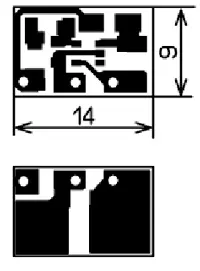 Если применить малогабаритные элементы для поверхностного монтажа, печатная плата устройства будет небольшой. Её чертёж показан на рис. 2. Она двухсторонняя. Через отверстия в плате контактные площадки с двух сторон соединены между собой. Светодиод, конденсатор и резистор R2 установлены на одной стороне, остальные элементы - на другой. Диоды CDLL4148 можно заменить выводными диодами серий КД521 и КД522. Стабилитрон - маломощный на напряжение стабилизации 3...3,3 В. Резисторы и конденсатор - для поверхностного монтажа типоразмера 0805 или 1206. Дроссель должен быть рассчитан на ток 200...250 мА, подойдут дроссели - LQY4N, LQN4N, SDR0703, или выводной серии ЕС24. Светодиод может быть любой, а поскольку ток через него достаточно большой, применение светодиода повышенной яркости свечения необязательно.
