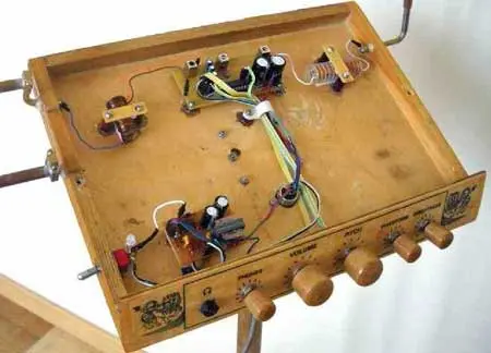 Фотоснимок инструмента со снятой верхней крышкой приведён на рис. 10. Угол наклона его плоскости относительно горизонта - около 30о. Антенна управления громкостью сделана раскладной (установлена на шарнирах), а антенна высоты тона - съёмной. Это удобно для транспортировки. Металлические части антенн, проходящие сквозь деревянные стенки корпуса, закреплены эпоксидным клеем, служащим также дополнительным изолятором. Толщина клеевого шва - около 1 мм.