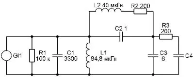 Схема модели связанных контуров перестраиваемого генератора показана на рис. 6. Здесь GI1 - источник испытательного тока (имитирует коллекторную цепь транзистора VT1); R1, C1, L1 - соответственно эквивалентное резонансное сопротивление, ёмкость и индуктивность контура генератора; С2, R2, R3 - паразитные параметры индуктивных и ёмкостных элементов; С3 - ёмкость антенны; С4 - наведённая рукой ёмкость, которая в процессе моделирования принимала значения 0; 0,01; 0,02; 0,04; 0,1; 0,2; 0,4; 0;8; 1,6; 5; 20 и 100 пФ.