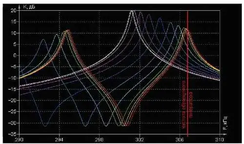 Полученные в результате моделирования АЧХ исследуемой цепи изображены на рис. 7. Красная кривая соответствует случаю, когда рука и тело исполнителя находятся далеко от антенны (С4=0), а резонансные частоты контуров L1C1 и L2C2C3 совпадают. На этой частоте АЧХ имеет глубокий провал. Одинаковость высоты пиков и нулевой фазовый сдвиг на этих частотах (на рисунке не показан) создают неоднозначные условия для генерации - возможны перескоки частоты с одного пика на другой.
