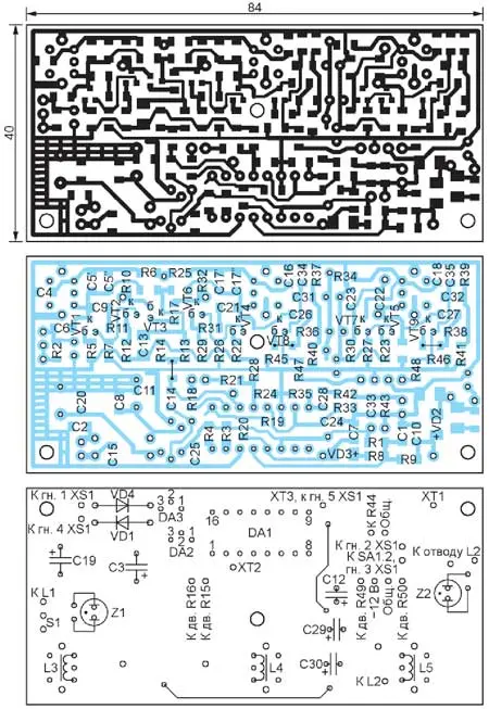 Почти все компоненты терменвокса расположены на односторонней печатной плате размерами 84x40 мм из фольгированного стеклотекстолита. Её чертёж показан на рис. 8. Плата рассчитана на установку постоянных резисторов и конденсаторов для поверхностного монтажа. Микросхему DA1 целесообразно установить в панель. Корпусы оксидных конденсаторов C12, C29 и C30, расположенные в ряд, служат экраном между генераторами.