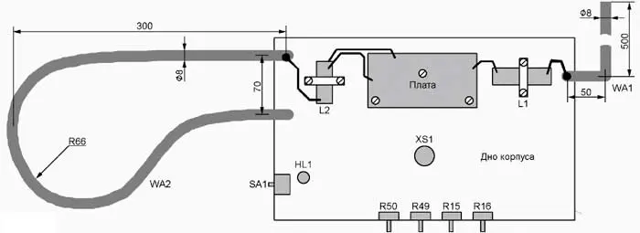 Подключите антенные цепи, полностью соберите инструмент и закройте верхнюю крышку. Установите его в рабочее положение на микрофонную стойку или треногу. Освободите от посторонних предметов пространство в радиусе около метра от антенн. Движки переменных резисторов R49 и R50 поставьте в среднее положение.