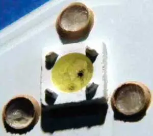 Подсветка этой матрицы осуществляется двумя светодиодными модулями, каждый из которых содержит девять включённых последовательно светодиодов. Определив неисправный модуль, со всех его светодиодов были сняты пластиковые рассеиватели света. Неисправный светодиод был обнаружен сразу по чёрному пятну на кристалле (рис. 1), оказалось, что в нём обрыв. Остальные светодиоды были проверены с помощью лабораторного блока питания с выходным напряжением 6 В, который подключался к их выводам с помощью тонких иголок через токоограничивающий резистор сопротивлением 390 Ом.