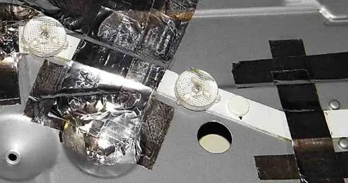 При неисправностях таких и подобных светодиодных модулей есть одна особенность - всегда повреждается первый или последний светодиод, поскольку тонкий алюминиевый тепло-отвод, к которому приклеена печатная плата со светодиодами, на концах модуля "висит" в воздухе. Чтобы улучшить охлаждение светодиодных модулей, стороны этого теплоотвода смазаны тонким слоем теплопроводной пасты и плотно прижаты к массивному металлическому шасси матрицы, устранив провисания. Для этого на пластмассовые фиксаторы со стороны шасси надеты дополнительные шайбы, чем устранено провисание модулей в местах установки этих фиксаторов. Но поскольку таких фиксаторов всего три на каждый модуль, потребовалась дополнительная фиксация. Для этого на печатную плату наклеены полоски из тонкой липкой ленты, а поверх них - по 8...10 слоёв липкой алюминиевой фольги, добиваясь плотного прижатия алюминиевого теплоотвода к шасси матрицы. Большое число слоёв фольги необходимо для того, чтобы она также выполняла функцию дополнительного теплоотвода (рис. 2). Липкая лента, на которую наклеена фольга, необходима для того, чтобы фольга не протёрла изолирующую краску на печатной плате.