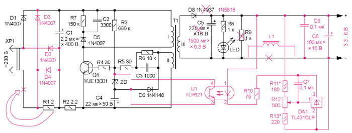 Для повышения стабильности выходного напряжения и возможности его регулировки на втором этапе доработки введена микросхема DA1 (параллельный стабилизатор напряжения). Управление преобразователем и обеспечение гальванической развязки реализованы с помощью транзисторной оптопары U1. Для подавления импульсных помех с частотой автогенератора дополнительно установлен фильтр L1C6C8. Резистор R9 удалён.