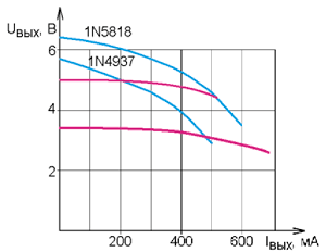 В оригинальном ЗУ в выходном выпрямителе применён диод 1N4937, который заменён диодом Шотки 1N5818, что позволило увеличить выходное напряжение. После такой доработки сняты зависимости выходного напряжения от тока нагрузки, которые показаны синим цветом на рис. 3. Амплитуда пульсаций выходного напряжения с ростом тока нагрузки увеличивается с 50 до 300 мВ. При токе нагрузки более 300 мА появляются пульсации частотой 100 Гц.