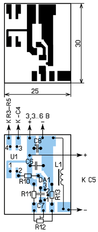 Элементы (кроме переменного резистора) второго этапа доработки размещены на односторонней печатной плате из фольгированного стеклотекстолита толщиной 0,5...1 мм, её чертёж показан на рис. 4. Монтаж - со стороны печатных проводников. Можно при-менить постоянные резисторы МЛТ, С2-23, Р1-4, конденсаторы С6, С7 - керамические, С5 - оксидный импортный, он снят с материнской платы персонального компьютера, С8 - оксидный низкопрофильный импортный. Поскольку выходное напряжение приходится устанавливать нечасто, применён не переменный резистор, а подстроечный PVC6A (POC6AP). Это позволило установить его на задней стенке корпуса ЗУ. Дроссель L1 намотан в один слой проводом ПЭВ-2 0,4 на цилиндрическом ферритовом магнитопроводе диаметром 5 мм и длиной 20 мм (от дросселя ИИП компьютера). Можно применить оптопары серии РС817 и аналогичные. Плату с деталями (рис. 5) вставляют в свободное место ЗУ (частично над конденсатором С1), соединения проводят отрезками изолированного провода. Для подстроечного резистора в задней стенке ЗУ делают отверстие соответствующих размеров, в которое его вклеивают. После проверки устройства резистор R12 снабжают шкалой (рис. 6).