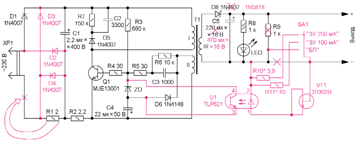 В простых ЗУ, к которым относится дорабатываемое, зачастую применён однополупериодный выпрямитель сетевого напряжения, хотя на плате, в большинстве случаев, есть место для размещения диодного моста. Поэтому на первом этапе доработки установлены недостающие диоды, а резистор R1 с платы удалён (он установлен на месте диода D4) и припаян непосредственно к одному из штырей вилки XP1. Следует отметить, что встречаются ЗУ, в которых отсутствует и сглаживающий конденсатор С1. Если это так, необходимо установить конденсатор ёмкостью 2,2...4,7 мкФ на номинальное напряжение не менее 400 В. Затем конденсатор С5 заменяют другим с большей ёмкостью. В таком варианте доработки ЗУ показаны на рис. 2.