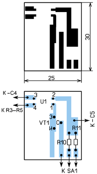 Большинство деталей размещают на односторонней печатной плате (рис. 8 и рис. 9) из фольгированного стеклотекстолита толщиной 0,5...1 мм. Полевой транзистор должен быть с начальным током стока не менее 25 мА. Переключатель - любой малогабаритный движковый на одно или два направления и три положения, например SK23D29G, его размещают на задней стенке ЗУ и снабжают шкалой. Если применить переключатель на большее число положений, можно увеличить число номинальных значений тока и расширить тем самым номенклатуру заряжаемых аккумуляторов.