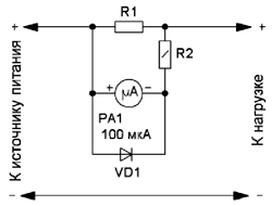 Для измерения тока в источниках питания или зарядных устройствах (ЗУ) часто применяют стрелочные приборы. В большинстве случаев они оказываются удобнее, чем цифровые, особенно если нет необходимости в точных измерениях. В качестве амперметров зачастую используют микроамперметры с током полного отклонения от 100 до 1000 мкА совместно с шунтами - низкоомными резисторами, которые подключают параллельно (рис. 1). Рассмотрим для примера микроамперметр М260М с током полного отклонения Iмакс = 100 мкА и сопротивлением рамки (измерено у конкретного экземпляра) Rp = 1,57 кОм (рис. 2). Для отклонения стрелки на максимальное деление шкалы на этот микроамперметр следует подать напряжение UPA1 = Iмакс · Rp = 0,157 В. Поэтому, например, для измерения тока 1 А на шунте (резисторе R1) должно падать именно такое напряжение (т. е. R1 = 0,157 Ом). Для измерения тока 10 А это напряжение также должно быть 0,157 В. В первом случае на резисторе рассеивается мощность 0,157 Вт, во-втором - 1,57 Вт. Это расточительно, да к тому же потери напряжения - тоже существенный недостаток, особенно при небольшом напряжении источника питания. Для защиты от перегрузки по току обычно вводят токоограничивающий резистор R2 и защитный диодVD1 (обычно кремниевый). Эти элементы могут внести дополнительную погрешность измерения, в том числе и температурную.