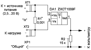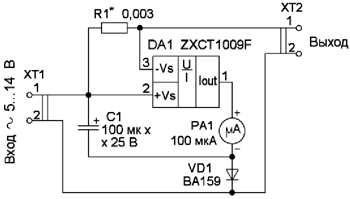 Если для построения амперметра переменного тока использовать микроамперметр постоянного тока, кроме шунта, потребуется выпрямитель, что приведёт к дополнительному падению напряжения на таком измерительном приборе. Другой вариант - применение микросхемы ZXCT1009F. Обусловлено это тем, что её выходной ток, который зависит от напряжения между входами, протекает только при определённой полярности этого напряжения. Плюс должен быть на входе +Vs (вывод 2), минус - на входе -Vs (вывод 3). При другой полярности на выходе микросхемы присутствует только потребляемый ею ток. Таким образом, микросхема ZXCT1009F работает как выпрямитель, поэтому к её выходу можно подключить микроамперметр постоянного тока. Согласно паспортным данным, предельная частота микросхемы - 300 кГц при входном напряжении до 10мВ и 2МГц при входном напряжении 1 В. Это означает, что амперметр на её основе должен иметь достаточно большой частотный диапазон. Но исследование этого устройства в диапазоне частот не проводилось.