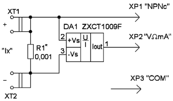 Чтобы продолжительное время измерять ток до 20...30 А, на основе микросхемы ZXCT1009F можно сделать простую приставку к мультиметру. Падение напряжения и рассеиваемая на ней мощность при измерении тока будет в 10 раз меньше, чем в указанных мультиметрах. Схема приставки к мультиметру из серии M-83x показана на рис. 14. Схема включения микросхемы - стандартная. Питается приставка от внутреннего стабилизатора мультиметра, напряжение с которого выведено на контакт "С" гнезда для подключения транзисторов структуры n-p-n, поэтому дополнительного источника питания не требует. Выходной ток микросхемы DA1 и напряжение питания на неё поступают через измерительную цепь мультиметра, который включён в режим измерения тока на пределе "200μ" (200 мкА). Обратите внимание, что в некоторых мультиметрах серии М-83х, например М-838, минимальный предел измерения тока - "2000μ" (2000 мкА). Микросхема DA1 совместно с резистором R1 работает как зеркало тока с коэффициентом преобразования К = 1 мкА/0,1 А = 10-5, т. е. измеренному мультиметром току 1 мкА соответствует ток 0,1 А через резистор R1.